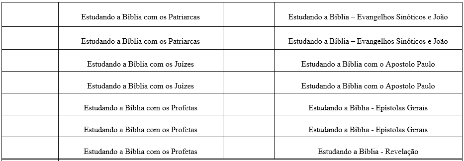 Ementa: tem como objetivo proporcionar ao aluno uma visão panorâmica do estudo da Bíblia, aproximando-o da vida acadêmica, ou apenas para obter um conhecimento mas claro de questões de valores relacionados a Palavra de Deus.